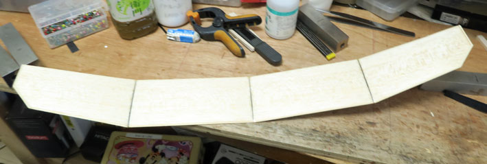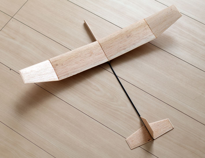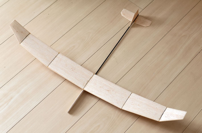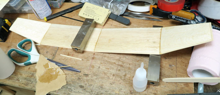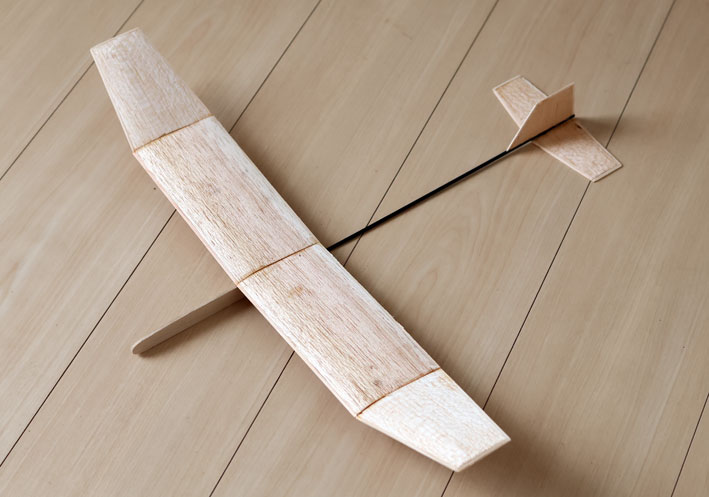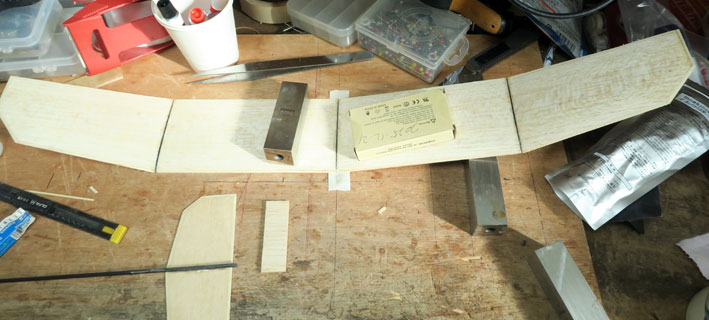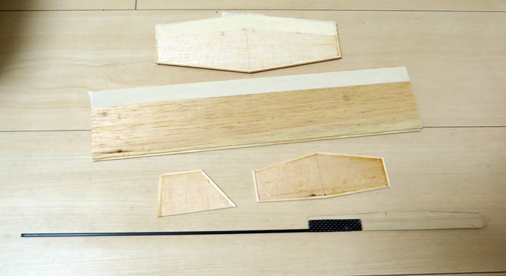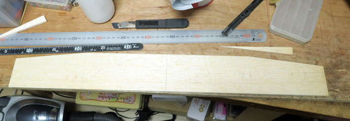 主翼は、5mm C カットバルサを使用します。周囲には、2x2 ヒノキを瞬間接着剤で貼ります。 |