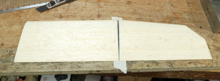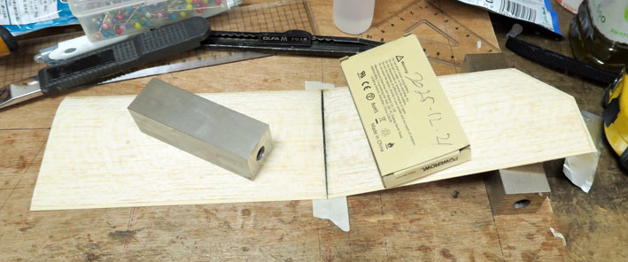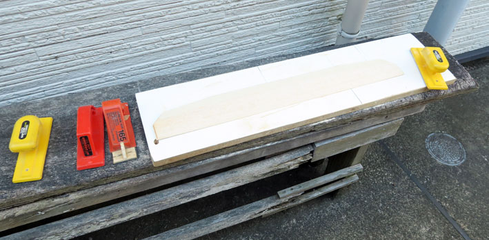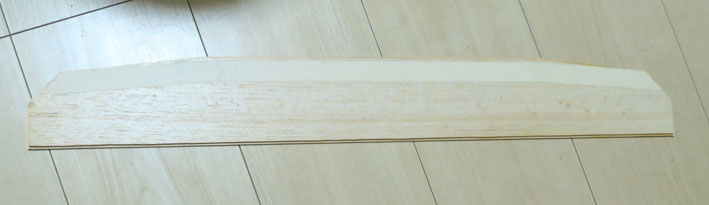 翼にマスキングテープを貼り、サンディングの目安とします。 |
