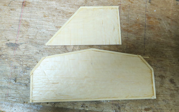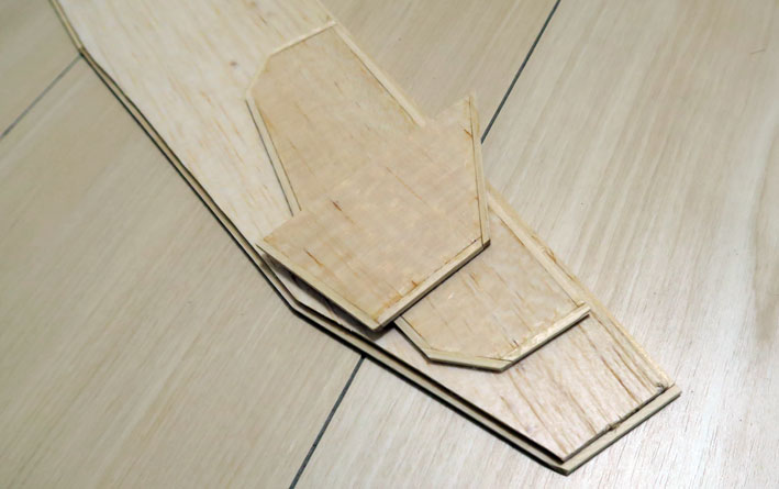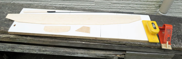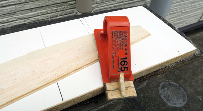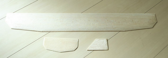 尾翼は、2mm C カットバルサを使用します。周囲には、2x2 ヒノキを瞬間接着剤で貼ります。 |