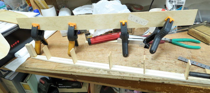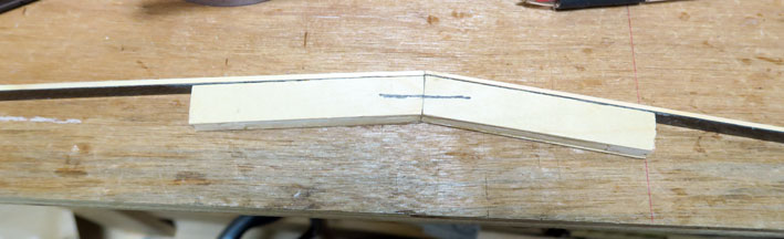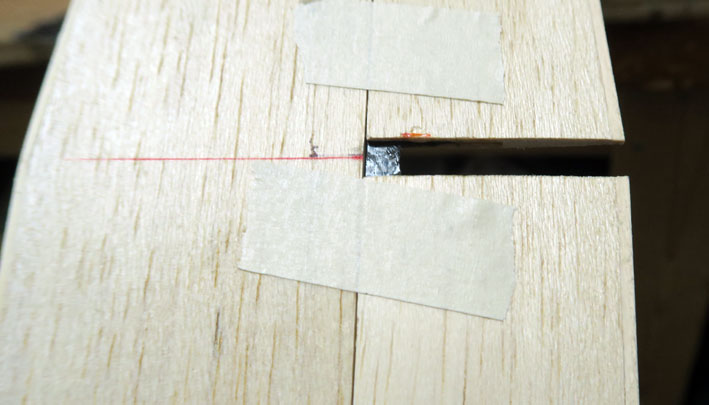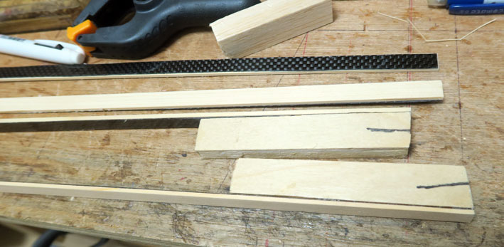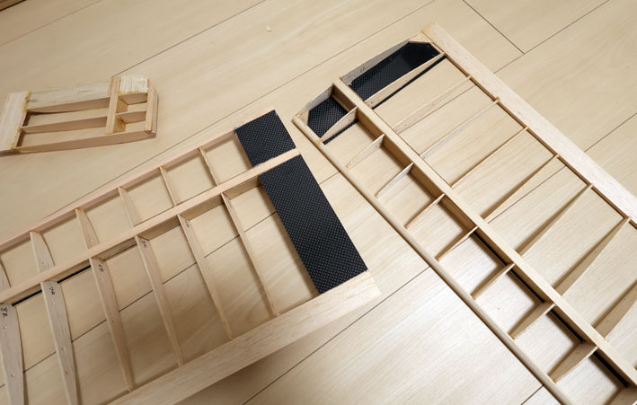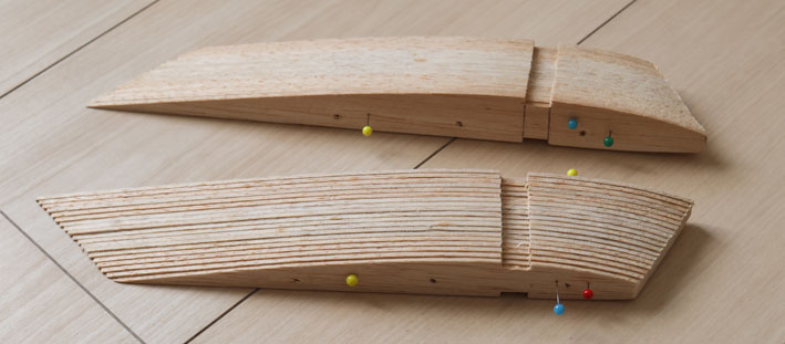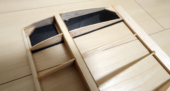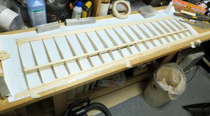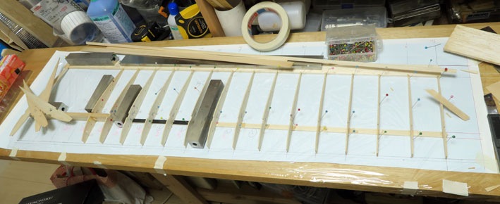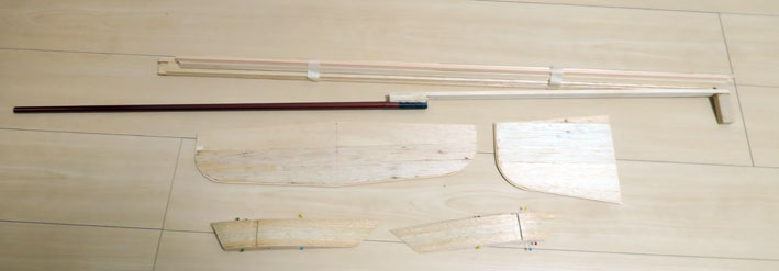 前縁は 6x8mm ヒノキ、後縁は 5mm バルサに 2x2 ヒノキを接着して加工します。 |