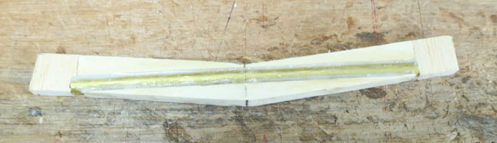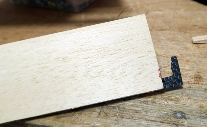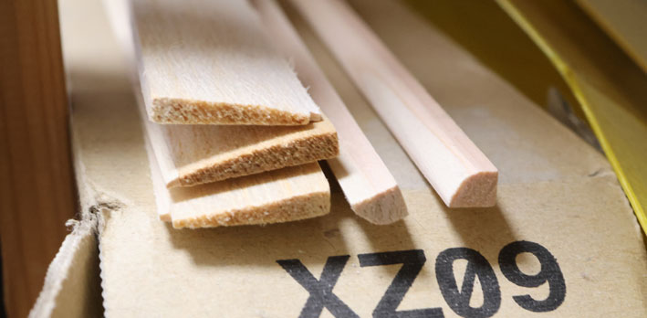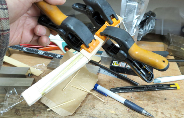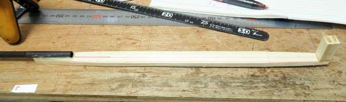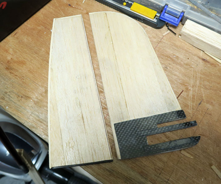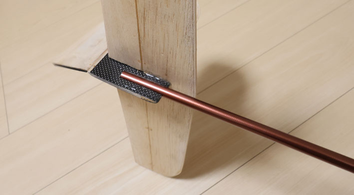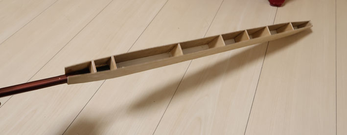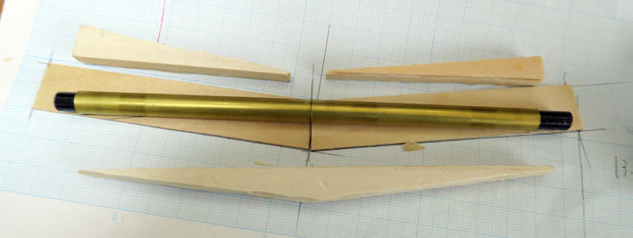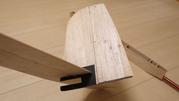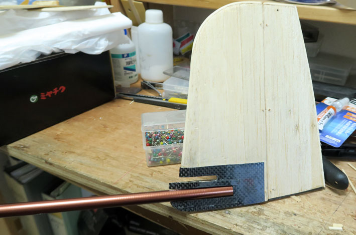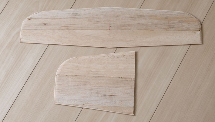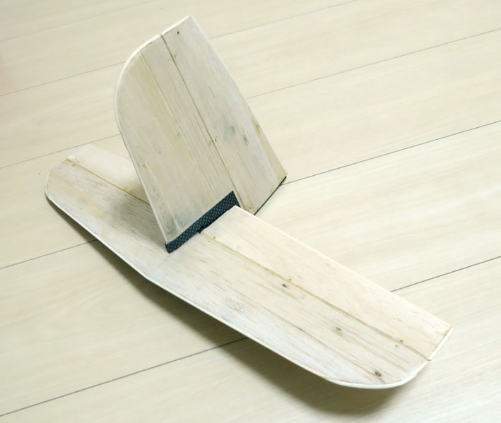 尾翼は、4mm バルサに 2x2 ヒノキを全周に接着して加工します。 |